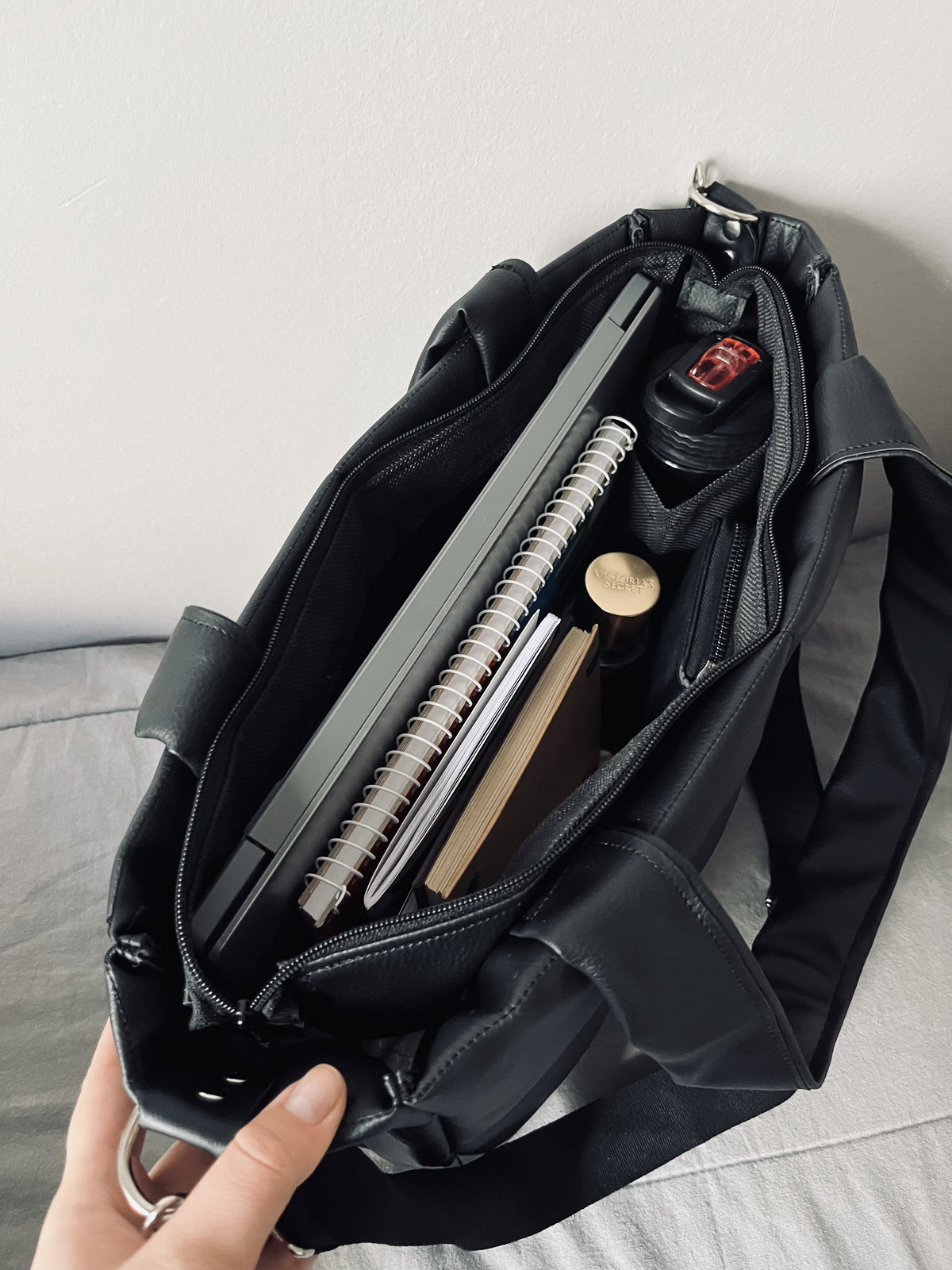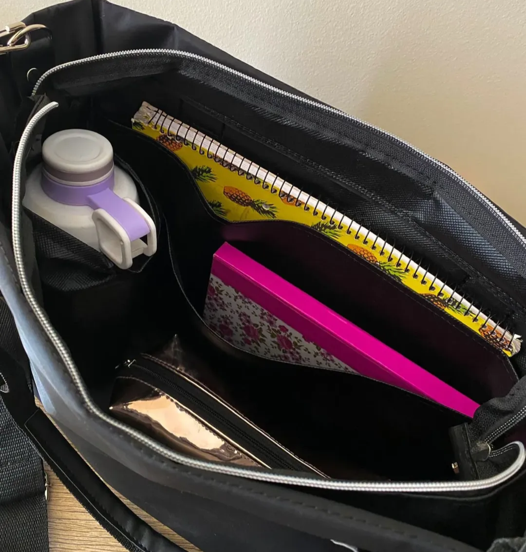 Dos bolsillos internos del ancho total del bolso y bolsillo para vaso o botella